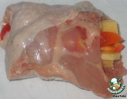 внутрь куриного окорочка кладем перец разного цвета, сыр и помидор