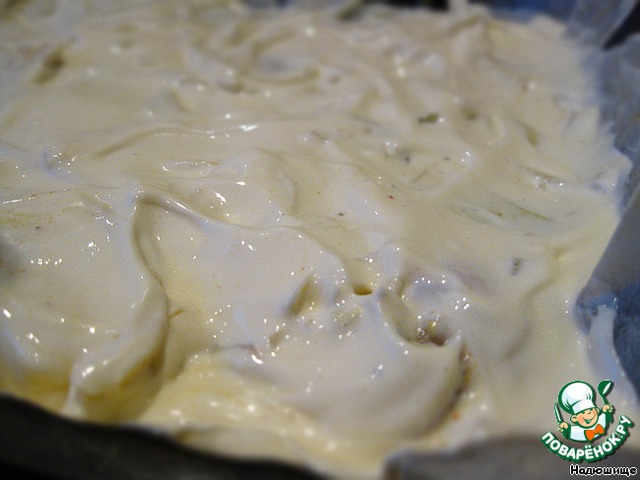 Теперь просто заливаем майонезом. Ставим в духовку и запекаем до готовности на маленьком огне, если у вас сильная духовка, как у меня.