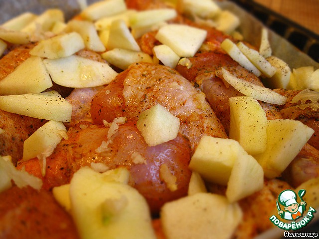Майонез, мясо и яблоки пустят сок и ничего не пригорит.