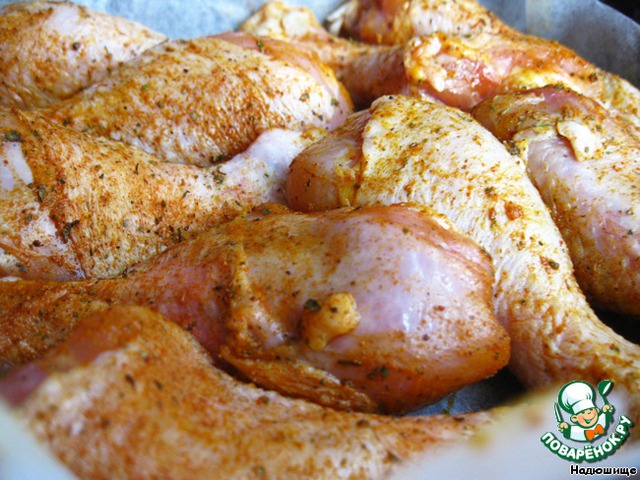 Смазываем ножки специями и укладываем их в глубокую форму для запекания.