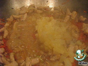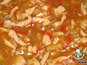 И заключающий этап. Чтобы соус приобрел некую вязкость, мы вливаем разведенный в воде крахмал. Соус загустел - блюдо готово!!