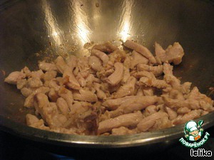 Вок (сковороду, сотейник) хорошо нагреть, влить масло и быстренько обжарить наше мяско, чтобы оно схватилось.