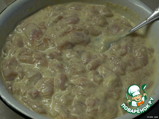 Добавить к филе сливки, взбитое яйцо, майонез, куркуму, душистый и чeрный перец, муку, воду и посолить по вкусу.