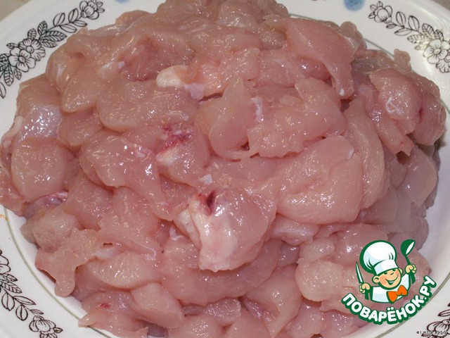 Куриное филе помыть, обсушить и порезать на мелкие кусочки.