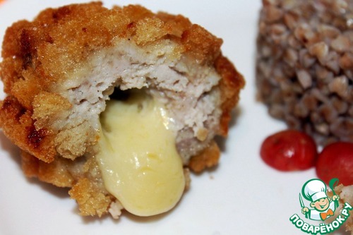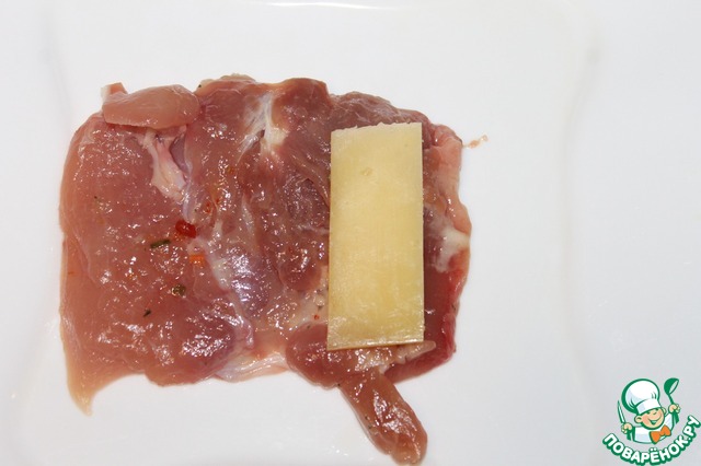 На отбитое куриное филе положить кусочек сыра, завернуть рулетиком,