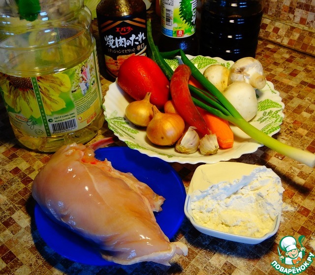 Курицу порезать тонкими пластинками, обвалять их в муке и обжарить во фритюре (фото оказалось не в фокусе). Отложить в сторону.