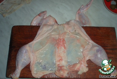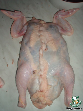 Итак, первым делом нужно "раздеть" нашу курицу. Для этого с нее аккуратно снимаем шкурку, оставляя нетронутыми только крылышки и нижнюю часть ноги (т.е. голень). Все отделенное мясо откладываем, оно нам понадобится для фарша. Вот, получается такая штука, как на фото.