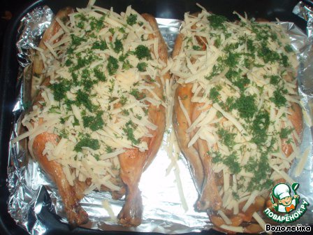 После снимаем фольгу, смазываем курицу майонезом, посыпаем сверху тертым сыром и зеленью. Отправляем в духовку минут на 30 (не меньше), чтоб сыр расплавился и курочка приобрела золотистый цвет.