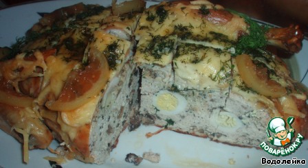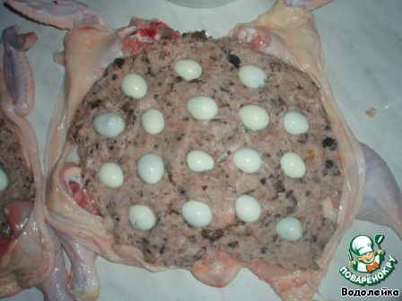 Дальше берем нашу "курицу" обрезанную, раскладываем на столе и сверху выкладываем фарш,а по всему фаршу - вареные перепелиные яйца (как на фото).
