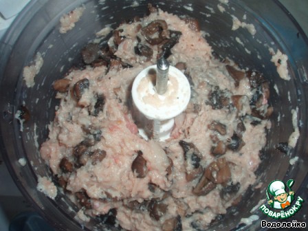 Грибы отварить, обжарить. Теперь берем все мясо, которое мы отделили от курицы, отделяем его от костей, где надо и измельчаем в блендере (или мясорубке) + обжаренные грибы + размоченная булка + сливки + зелень (я зелень бросить забыла :-[ ). Булки я положила 2-3 кусочка,а сливок налила на "глаз". Если примерно, то может 25-30 мл. Я такие вещи, как булка и сливки в фарш кладу на "глаз". В фарш добавляем соль, специи по вкусу.
