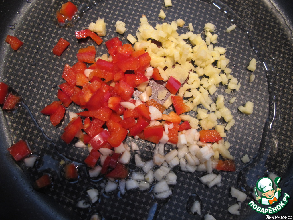 Имбирь, чеснок и перец очистить и нарезать мелкими кубиками.