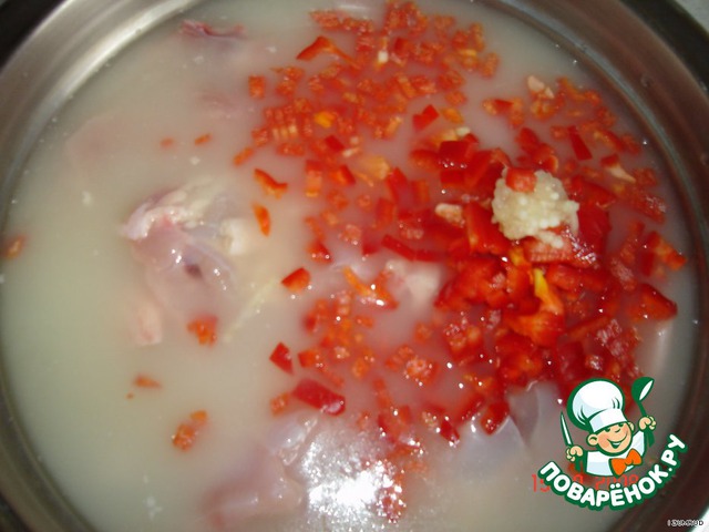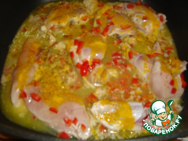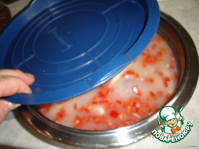 Залить курочку сывороткой, выдавить чеснок и добавить нарезанный болгарский перец.