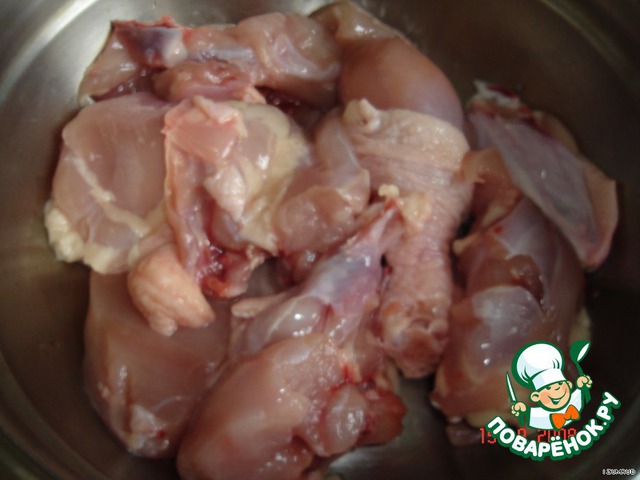 Курочку разделить на небольшие кусочки (шкуру лучше снять).