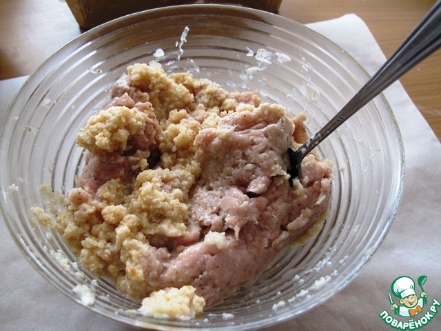 К фаршу добавить лук, сухари, специи, соль. Замесить, как на котлеты.