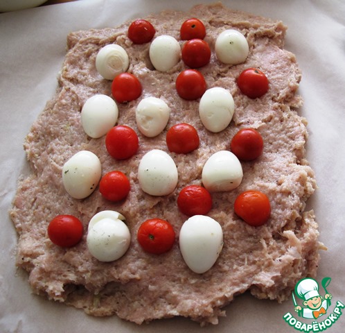 Расстелить на столе лист бумаги для выпечки, смазать растительным маслом и распределить фарш в виде листа по размеру формы для выпечки. Сверху равномерно распределить яйца и черри, оставив несколько помидорок для украшения.