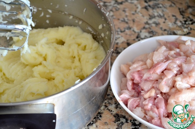 1. Отварить картошку до готовности (минут 25 в кипящей воде), слить воду, снять шкурку и размягчить миксером до однородной массы. Пока варится картошка мелко порезать курицу. Я использую грудку и ножки, а каркас и крылья оставляю на бульон для других рецептов. Можно купить просто филе, но это скучно и менее экономно. Резать курицу надо очень мелко, не то чтобы прямо в фарш, но мелко. Для этого удобно использовать острые кухонные ножницы.