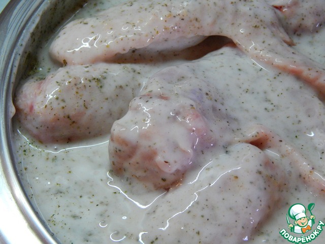 Крылышки подготавливаем, выкладываем в глубокую посуду и заливаем смесью кефира, хмели-сунели и соли; минимум на 90 минут забываем про них.