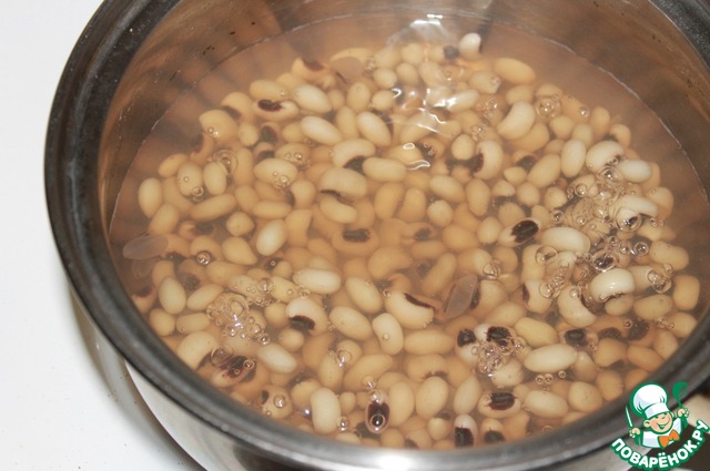 Фасоль Черный глаз от Мистраль я замочила утром и убежала на работу. Хоть и пишут на упаковке, что этот сорт замачивать не надо, но у меня вечером очень мало времени на приготовление ужина для семьи, так что я ее залила водичкой, а вечером слила эту воду, залила свежей водички, и она сварилась за 20 минут, благодаря тому, что у этого сорта фасоли очень тонкая шкурка. Очень вкусная фасоль. Нежная, с ореховым привкусом.