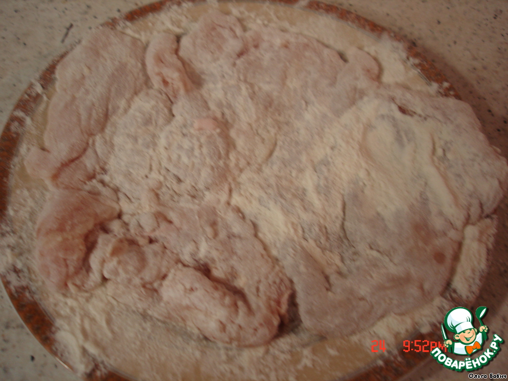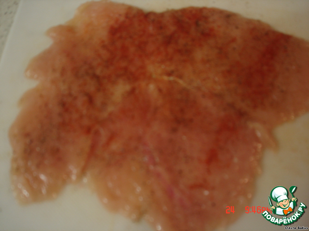 Куриную грудку отбить, посолить, добавить специи, автор предлагает добавить майоран (у меня такого нет)