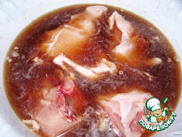 Курицу залить квасом (чтобы закрывал почти полностью). Оставить на 4-5 часов в прохладном месте.