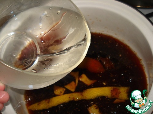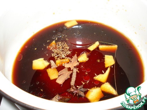 В кастрюлю налейте соевый соус, вино, растительное масло, измельченный имбирь и чеснок. Добавьте сахар, полоску цедры с лимона, перец чили (берите по вашему вкусу)