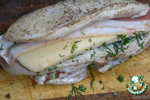 | Сочная куриная грудка, фаршированная сыром и беконом с чесночно-укропной добавкой. Очень вкусное и сытное блюдо. |