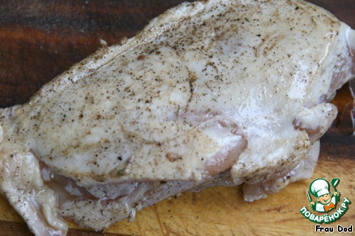 Натереть курицу солью с перцем и очень быстро обжарить со всех сторон и изнутри тоже. Положить на горячую сковороду одной стороной, сразу же перевернуть, сразу же раскрыть и обжарить обе серединки. По 5 секунд.