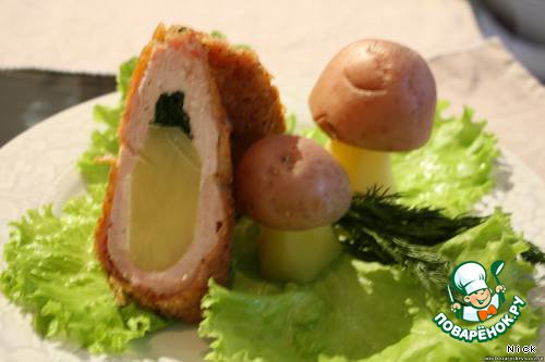 На куриную грудку выкладываем картофель и укроп (верхнюю часть) .Заворачиваем филе ,придаем форму котлеты и панируем в муке, далее в яйце, и в сухарях.