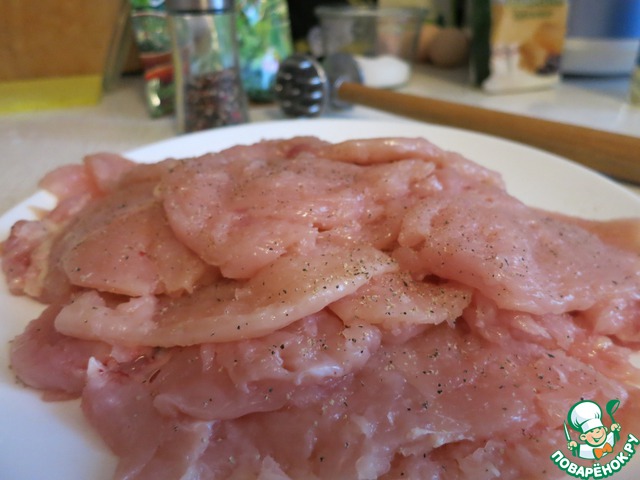 Грудки отбиваем и режим на порционные кусочки. Солим, перчим и оставляем немного замариноваться.