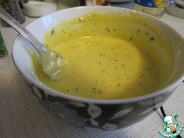 Тем временем готовим яичную смесь. Для этого смешаем яйца, сметану, муку, зелень. Немного солим и перчим. Не забываем, что сыр тоже добавит блюду солености. Натираем сыр на средней терке.