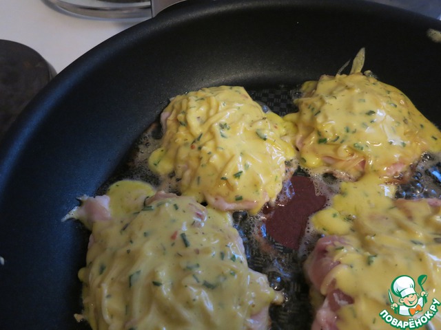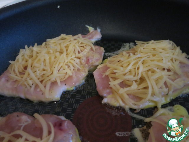На отбитый кусочек мяса наливаем ложку кляра и выкладываем отбивную на сковородку с разогретым маслом яичной стороной вниз. Сверху посыпаем тертым сыром и аккуратно заливаем сверху кляром.