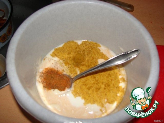 Готовим соус: для этого смешиваем молоко, яйцо, майонез (или сметану)и специи. Для того, кто любит поострее (что предусмотрено в индийской кухне), можно добавлять побольше перца или острую приправу карри. Чтобы соус был погуще, можно добавить немного муки.