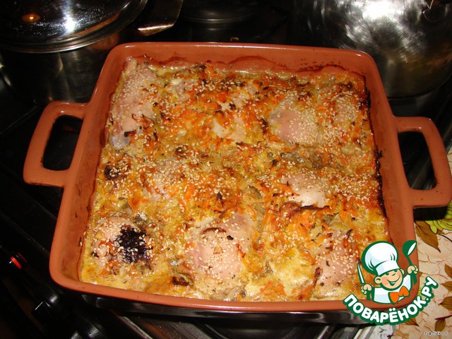 Выкладываем курицу в глубокую огнеупорную посуду, сверху выкладываем пассерованные лук и морковь и заливаем молочной смесью.