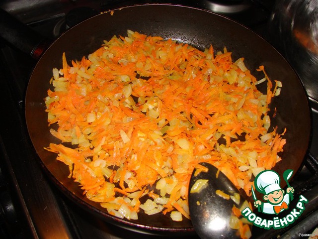 В это время мы натираем на терке морковь и режем мелко лук. Затем пассеруем их на сковородке.