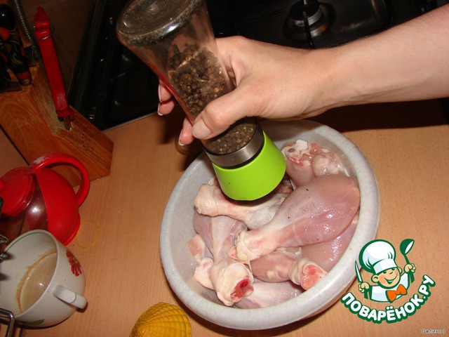 Куриные окорочка, предварительно избавленные от кожицы и порезанные (каждый окорочок на 2 части), солим и перчим и оставляем настаиваться. Из 5 окорочков у меня получилось 10 кусков.