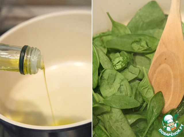 В кастрюле или на сковороде разогреваем пару ложек оливкового масла и выкладываем шпинат.