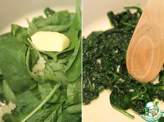 Потом в шпинат добавляем сливочное масло, чеснок (мелко нарезанный или пропущенный через чеснокодавку), немного присолим, и тушим минут 5, помешивая.