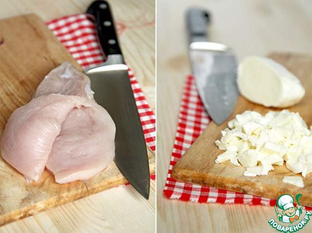 Куриную грудку промоем, разрежем, сделав кармашек и посолим, моцареллу нарежем мелкими кубиками.