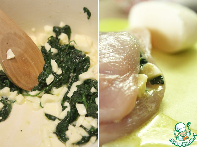 Смешиваем моцареллу со шпинатом, начиняем курицу.