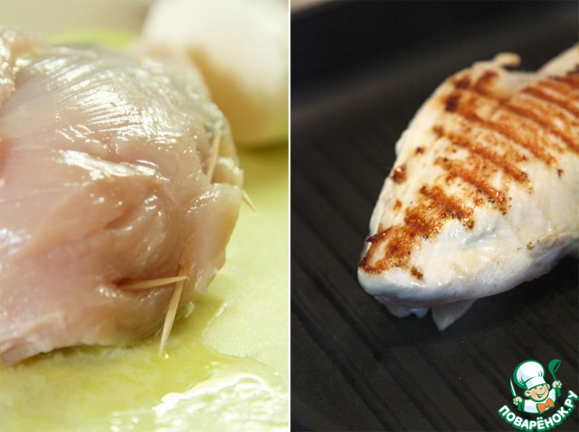 Дальше зависит от того, где вы будете готовить. Если Вы берете мясо с собой на пикник, заверните каждое фаршированное филе в фольгу, а потом пожарьте на решетке. Если у Вас есть электрогриль - Вам повезло! Грудка там получается чудеснейшая. Ну а если Вы устраиваете пикник дома - хорошо прожарьте мясо на сковороде-гриль (без добавления масла).