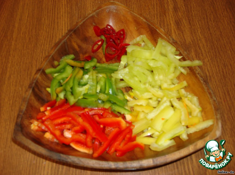 Перцы очистить от семян, сладкие нарезать полосками, жгучий - колечками.