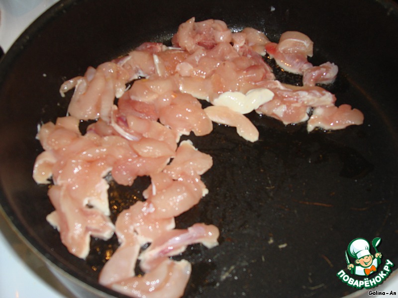 Куриное филе нарезать длинной соломкой, посолить.