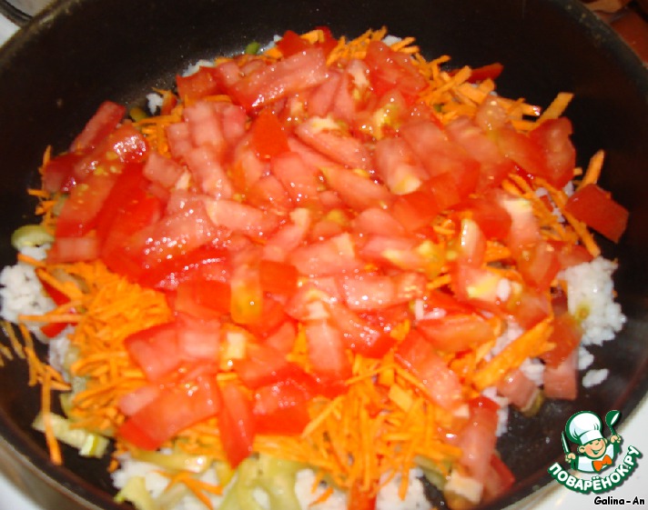 На рис: перцы, грибы (по желанию), морковь, помидоры.
