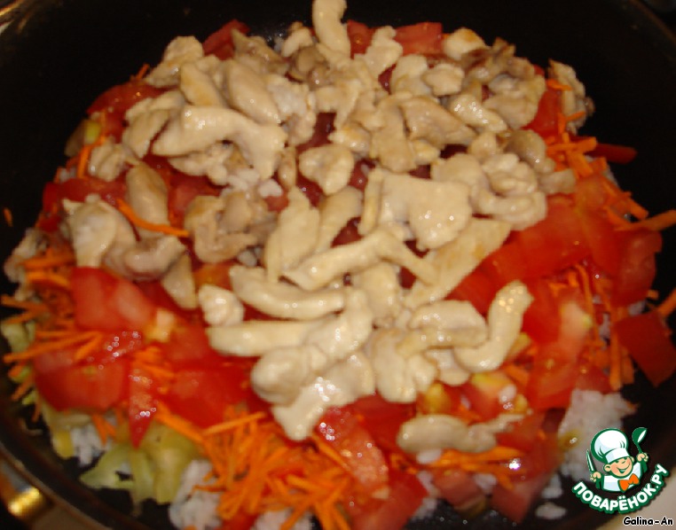 И сверху куриное филе. Тушить на слабом огне 10-15 минут.