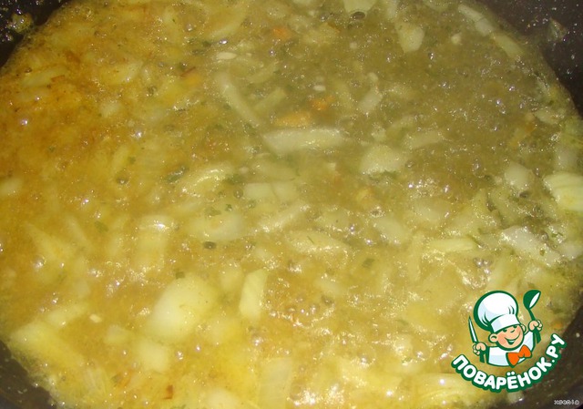 Добавляем в сковороду к луку и бульону, закрываем крышкой и тушим 10 минут, периодически помешивая