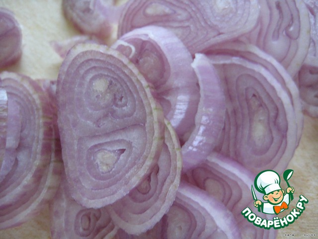 Лук очистим и нарежем тонкими кольцами.