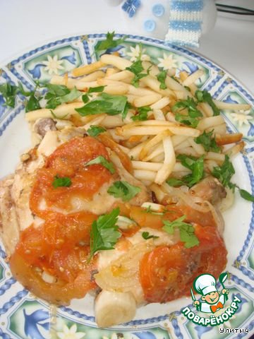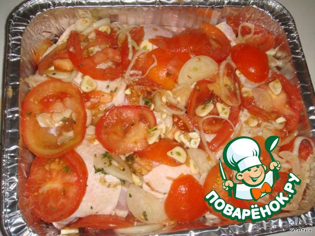 Помытую и обсушенную курицу или кусочки курицы, у меня было 3 четвертинки, выкладываем сверху на помидоры и заливаем оставшимся помидорным соусом.