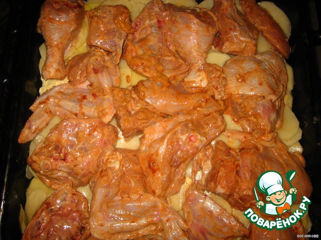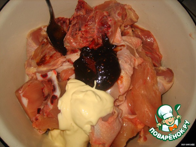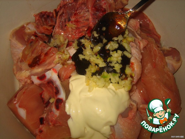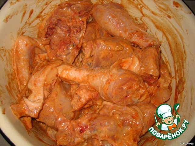 курицу разделываем на порционные кусочки, и смешиваем с приправами (соль, перец, аджика, чеснок, приправа для гриля)