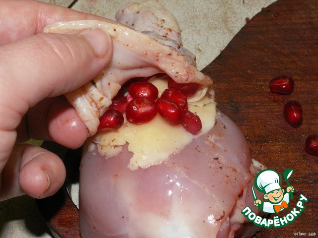 Горсть гранатовых зeрен аккуратно положить под кожу на сыр, при этом нужно придерживать кожу рукой.