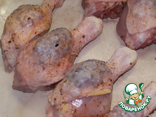 Противень смазать растительным маслом, положить подготовленные голени, смазать их взбитым яйцом и посыпать приправой.